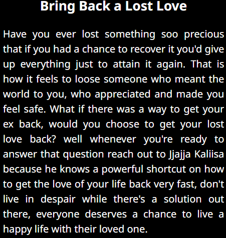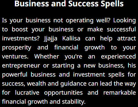 "I was on the verge of losing my failing business, but jjajja kalisa intervention turned things around. His powerful spells and guidance have revitalized my business, and now it's thriving. I'm deeply grateful for his assistance."